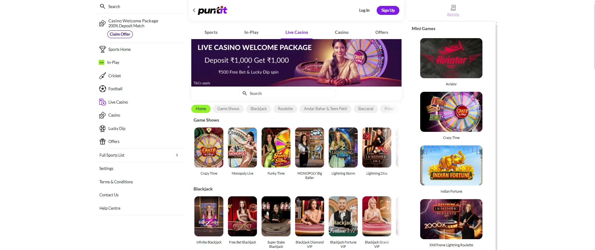 - Live Casino Welcome Package: Deposit ₹1,000 to get ₹1,000 bonus + ₹500 free bet + Lucky Dip spin.